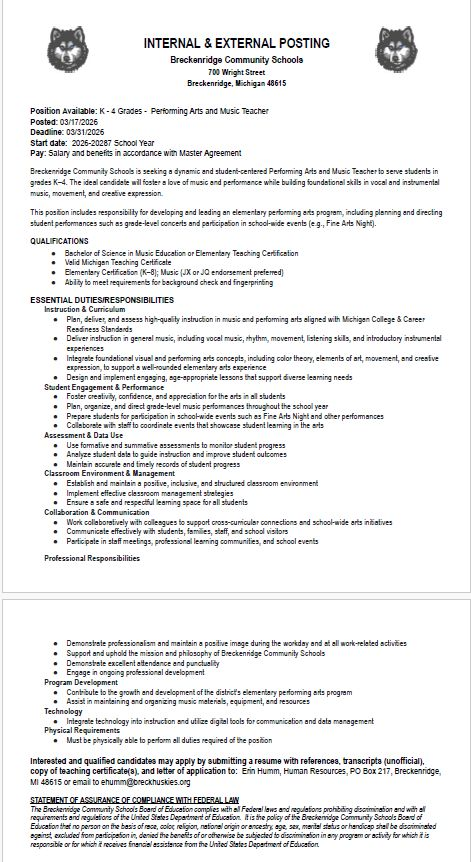 Breckenridge Community Schools: K-4 Grades Performing Arts and Music Teacher